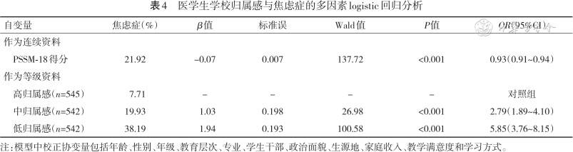医学生学校归属感与焦虑症的多因素logistic回归分析