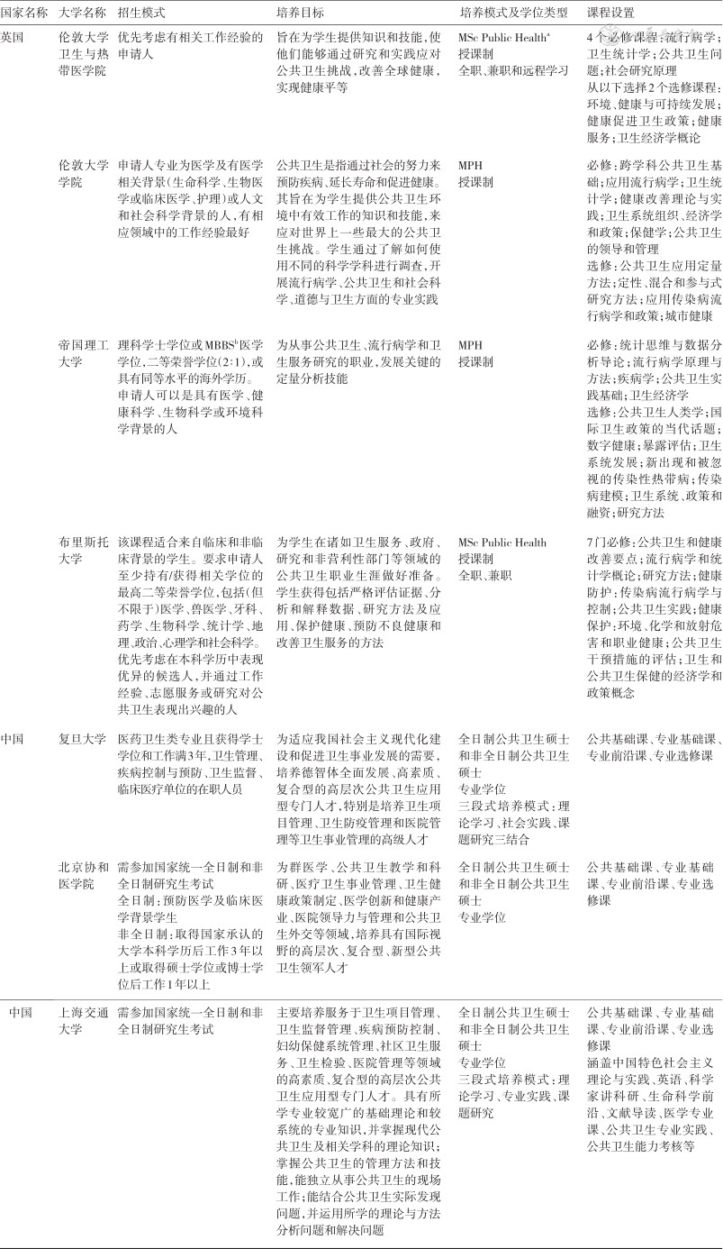| 中国 | 复旦大学 | 医药卫生类专业且获得学士学位和工作满3年,卫生管理、疾病控制与预防、卫生监督、临床医疗单位的在职人员 | 为适应我国社会主义现代化建设和促进卫生事业发展的需要,培养德智体全面发展、高素质、复合型的高层次公共卫生应用型专门人才,特别是培养卫生项目管理、卫生防疫管理和医院管理等卫生事业管理的高级人才 | 全日制公共卫生硕士和非全日制公共卫生硕士 专业学位 三段式培养模式:理论学习、社会实践、课题研究三结合 | 公共基础课、专业基础课、专业前沿课、专业选修课 |