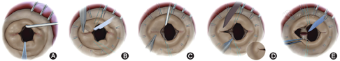 风湿性主动脉瓣病变的成形技术有很多,一些风湿性主动脉瓣有明显的交界融合,可以通过锋利的刀片切开(图2)。瓣叶病变可以从主动脉环下左心室流出道组织平面开始去除钙化或增厚部分。剥离增厚的瓣叶部分可以改善瓣叶活动度,增加其柔韧性、表面积和对合高度。心包补片在瓣叶游离缘位置时通常远期成形效果不佳,在游离边缘进行主动脉瓣修补时,主动脉瓣退化很快。可以尝试在瓣体中央位置进行心包扩大成形,或者完全用心包进行整体瓣叶的重建。Ozaki团队[21]采用模具测量进行个体化自体心包重建瓣叶技术。当然后者技术更多地被认为是一种无支架主动脉瓣置换,而非成形技术。修补用的心包多采用自体心包,聚四氟乙烯材料已经显示效果不佳。自体新鲜心包容易获取,具有一定生物活性。术中戊二醛处理的自体心包虽然操作更容易,但也更容易退化。也有术者使用成品的牛心包在术中进行瓣膜成形,但缺少长期随访效果观察。更具前景的组织工程补片尚在研究中。不同材料瓣膜成形的差异尚需要积累长期的随访结果。
