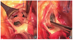 虽然风湿病主要影响二尖瓣,但是仍有30%的患者存在风湿性主动脉瓣的严重病变[20]。风湿性炎症病变使主动脉瓣增厚、纤维化、缩小成杯状,通常在交界处融合,有时伴有钙化。风湿性主动脉瓣的成形对于改善心室重塑、维持良好的左心室收缩功能和提高远期患者存活率尤其重要。此外,在抗凝依从性较差的年轻患者中,避免终身抗凝的机械瓣置换手术也具有重要意义。尽管目前在风湿性二尖瓣成形方面已经取得较好的临床效果,但是风湿性主动脉瓣病变由于其特殊的解剖学和组织病理学特征,成形的难度更大。