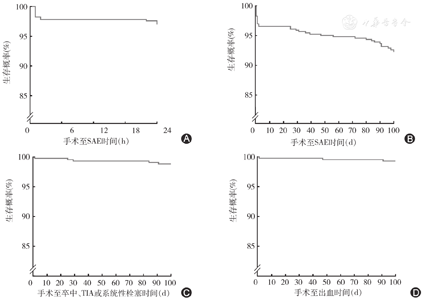 注:A图示术后24 h内无SAE;B图示术后100 d内无SAE;C图示术后100 d无卒中、TIA和系统性栓塞事件;D图示术后100 d无出血事件。SAE:严重不良事件;TIA:短暂脑缺血发作