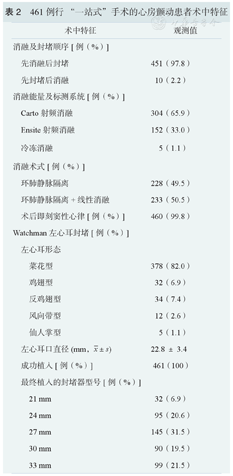 461例患者均成功完成肺静脉隔离,其中233例患者附加线性消融和/或心房基质改良。Watchman左心耳封堵器植入成功461例(100%)。术后100 d共观察到严重不良事件34例(7.8%),包括心包积液8例(1.7%)、卒中5例(1.2%)、血管穿刺并发症5例(1.2%)、出血3例(0.7%)、术后急性左心衰竭/心力衰竭再住院9例(2.2%)、急性冠状动脉综合征1例(0.2%)和需要再次消融的房颤或心房扑动复发3例(0.7%),无封堵器栓塞和死亡发生。