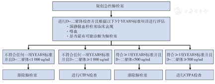 鉴于YEARS诊断流程的安全性和有效性,荷兰莱顿大学医学中心牵头启动改良YEARS诊断流程在疑似急性肺栓塞孕妇中应用的安全性和有效性研究[11],其改良之处在于一旦疑似孕妇的深静脉血栓征象为阳性,即行下肢加压静脉超声(compression ultrasound,CUS)检查,结果如阳性则启动抗凝治疗,如阴性则进入后续研究。最终494例疑诊急性肺栓塞孕妇进入YEARS诊断流程,其中242例孕妇符合1~3项YEARS标准,252例孕妇不符合任何一项YEARS标准。不符合任何一项YEARS标准的孕妇中164例D-二聚体< 1 000 ng/ml,依据研究设计排除肺栓塞,其中11例孕妇违反协定行CTPA检查但均排除肺栓塞;不符合任一YEARS标准的孕妇中88例D-二聚体≥ 1 000 ng/ml,建议行CTPA检查,其中13例违反协定结果未行CTPA检查,该组检出了1例肺栓塞患者;符合YEARS标准的患者中211例D-二聚体≥ 500 ng/ml,其中11例拒绝行CTPA检查,该组检出了15例肺栓塞患者;符合YEARS标准的患者中31例D-二聚体<500 ng/ml,1例患者违反协定行CTPA检查排除肺栓塞。分析显示,65%的患者在怀孕最初3个月避免了CTPA检查,而在最后3个月32%患者避免了CTPA检查。该研究证实了改良YEARS诊断流程在特殊人群即疑似肺栓塞孕妇中的安全性和有效性,其方案值得推广。