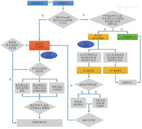 注:SBP,收缩压;PESI,肺栓塞严重程度指数;sPEI,简化的肺栓塞严重程度指数;CTA,CT血管造影;TEE,经胸超声心动图;BNP, B型利钠肽;PE,肺栓塞;PERT,肺栓塞救治团队;1 mmHg=0.133 kPa