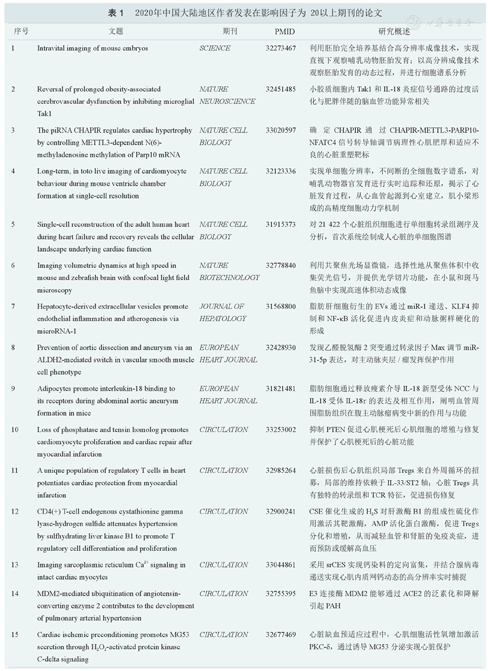2020年中国大陆地区作者发表在影响因子为20以上期刊的论文