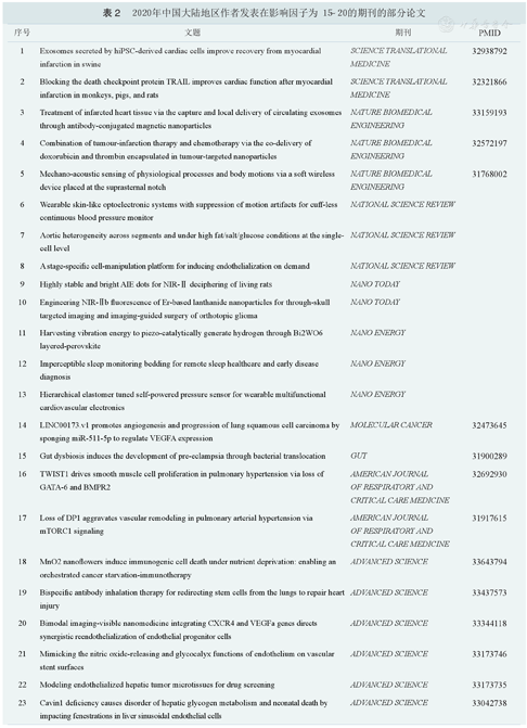 2020年中国大陆地区作者发表在影响因子为15~20的期刊的部分论文