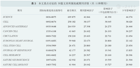 本文重点讨论的39篇在权威期刊发表的相关论文,共涉及11种期刊(表3)。其中,影响因子在20~30的期刊有9种,影响因子在20~25的期刊有7种,而影响因子在20~21的期刊有5种。