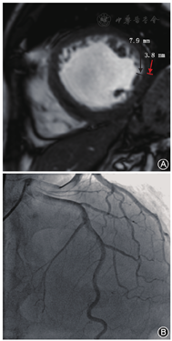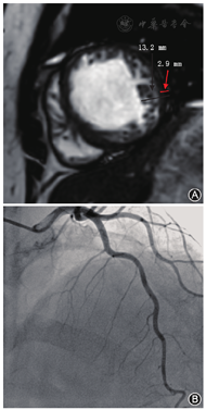 采用Philips Ingenia 1.5T MRI扫描仪,16通道相控阵心脏线圈,胸前导联心电门控技术。采用快速梯度回波序列完成长轴位四腔心和二腔心扫描及左心室短轴位扫描,定位扫描采用平衡快速梯度回波(balanced turbo field echo,BTFE),重复时间(repetition time,TR)2.7 ms,回波时间(echo time,TE)1.4 ms,层厚6 mm,扫描野(field of view,FOV) 450 mm×450 mm;电影序列TR 3.3 ms, TE 1.6 ms,层厚8 mm,FOV 300 mm×300 mm,动态屏气扫描,一个心动周期采集25帧图像。采用高压注射器经肘静脉团注钆双胺注射液,浓度0.1 mmol/kg,流速2.5~4.0 ml/s。采用快速梯度回波序列(TR 2.8 ms,TE 1.4 ms,层厚10 mm,层数3层,FOV 300 mm × 300 mm)获得短轴位首过灌注图像。首过灌注后二次注入钆双胺注射液,于对比剂注射10~15 min后行憋气快速场回波相位敏感反转恢复(phase sensitive inversion recovery-Turbo field echo-Breath hold,SIR-TFE-BH)序列扫描(TR 5.7 ms,TE 2.8 ms,层厚8 mm,FOV 300 mm×300 mm)获得短轴位延迟期图像。