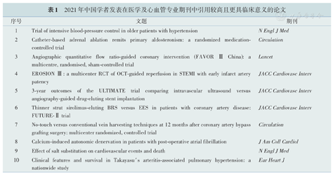 2021年中国学者发表在医学及心血管专业期刊中引用较高且更具临床意义的论文