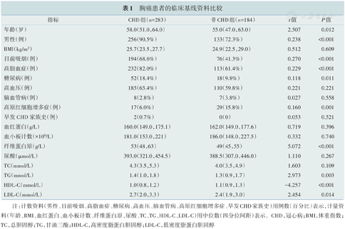 | 指标 | CHD组(n=283) | 非CHD组(n=184) | t值 | P值 |
