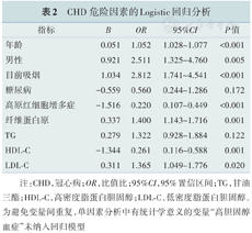 注:CHD,冠心病;OR,比值比;95%CI,95%置信区间;TG,甘油三酯;HDL-C,高密度脂蛋白胆固醇;LDL-C,低密度脂蛋白胆固醇。为避免变量间重复,单因素分析中有统计学意义的变量"高胆固醇血症"未纳入回归模型