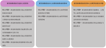 鉴于此,中国医师协会心血管内科医师分会组织国内外心血管及相关领域的专家制定《新型冠状病毒感染与心血管疾病诊疗中国专家共识(2023)》。在系统查阅整理目前已有的循证医学证据与诊疗经验的基础上,就新冠病毒感染引发或合并心血管疾病的临床问题,提出诊断和治疗建议,旨在规范新冠病毒感染疫情流行期间心血管疾病的诊断、治疗及康复。本共识涵盖新冠病毒感染及疫苗接种引发的心肌损伤、新冠病毒感染对心血管疾病患者的影响以及新冠病毒感染的其他心血管系统相关问题的指导建议3个方面,涉及11个临床核心问题(见图1)。