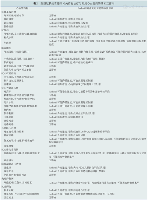 Paxlovid已被证明对新冠病毒感染的患者明确有效,但它与常用心血管药物有明确的药物相互作用(drug-drug interaction,DDI)[86]。以下网址可以获取Paxlovid与心血管药物的DDI(https://www. covid19-druginteractions.org/checker)。我们同时对常用心血管药物的DDI进行列举,见表2。