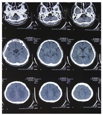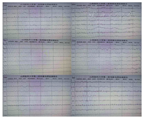 患者男,20岁,既往体健;车祸致双侧股骨干骨折,右侧胫腓骨骨折,左侧胫骨骨折,腹部闭合性损伤,乙状结肠断裂;就诊当地医院急诊科,呈失血性休克状态,皮肤、眼睑、口唇苍白,意识尚清,呈烦躁状态,对答切题,其余查体不详;当地医院给予急诊全麻气管插管下行乙状结肠造瘘术,术中情况不详,手术时长3 h,术后因意识不清,拔管困难进入重症医学科(intensive care unit,ICU)监护治疗,期间意识障碍进行性加重伴抽搐症状持续17 d,给予丙泊酚2 mg/(kg•h)持续泵入,当地ICU治疗17 d后,因家属要求,行气管切开术后转入我院治疗。入科时昏迷状态,体温36.5℃,呼吸频率:(respiratory rate,RR)22次/分,血压122/78 mmHg(1 mmHg=0.133 kPa),脉搏144次/分,瞳孔等大等圆,直径3 mm,直接及间接光反应灵敏;压眶反应(+),结膜反射(-),巴宾斯基征(-),霍夫曼征(-),奥本海姆征(-);间断无诱因抽搐发作伴呼吸急促,RR达40次/分,心率增快可达180次/分,面部潮红,鼻周苍白,头部及胸背部大汗,双下肢可见明显肌肉跳动,肌张力增强,每次发作持续1 min,每日发作可达10次;头颅CT(图1,图2,图3)未见异常,动态脑电图(图4)监测未见癫痫样波;丙戊酸钠片15 mg/(kg•d)鼻饲效果差,发作期间给予咪达唑仑效果可,持续泵入右美托咪啶1 μg/(kg•h)1周后观察到抽搐次数明显减少,时间缩短,记录到约4次/d;此时患者可睁眼,观察到眼球可向声源方向转动,欠灵敏,给予白天停止右美托咪啶泵入,序贯丙戊酸钠片15 mg/(kg•d)鼻饲,抽搐发作时咪达唑仑4 mg静推,观察到每日抽搐发作较前频繁,且发作时间延长,再次给予右美托咪啶1~2 μg/(kg•h)全天持续泵入,入科治疗20 d,患者意识清楚,有哭笑情绪表现,可行简单指令动作,如张口、吐舌,开始认识父母,仍间断有上述症状的突发突止,但发作次数逐渐减少,直至症状全部消失,患者完全清醒,受伤过程被其遗忘,康复出院;总住院30 d,治疗过程总结见图5。
