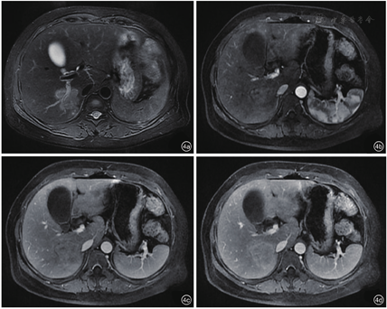 HIMT的超声、超声造影及CT、MRI影像表现多样,可能与不同病灶中病理组织学成分的比例及分布的差异相关[8]。超声常表现为单发、低回声肿块,内回声不均,形态多不规则,在特定切面可呈葫芦状、花生状或多结节融合状等特征性形态,部分病灶周围呈宽带状高回声[9],常无晕环,病灶后方多无明显增强或衰减。由于HIMT中纤维组织增生与慢性炎细胞比例不同,病灶凝固性坏死成分存在差异,随着病程的变化,其声像图表现多样。莫国强等[9]随访7例HIMT病灶发现,3例原低回声病灶内出现高回声,2例原病灶周边低回声晕消失并在11个月后为高回声圈替代,考虑为病变后期或陈旧性病灶内纤维组织增生、形成假包膜所致。本例患者肝脏肿瘤形态不规则,边界不清,与既往报道一致,结合穿刺病理,考虑肿瘤为病变后期,以增生为主。彩色多普勒血流显像(color Doppler flow imaging,CDFI)示肿块内多无明显血流信号,少数内部及周围可探及血流,血流阻力指数(resistance index,RI)多小于0.5[7]。由于不同病灶内新生血管血供程度不同,病灶内纤维化及炎性细胞成分有差异,HIMT超声造影模式亦可呈多样性,但文献报道[10,11],多数HIMT超声造影表现为恶性肿瘤增强模式,即"快进快出",因而超声造影有此模式者并不能完全排除HIMT可能。本例患者肝脏超声造影即因呈现"快进快出"灌注模式而被误诊为恶性。HIMT的CT影像学大多表现为肝内低密度肿块,其强化方式多样,有全瘤填充型、边缘强化型、分隔强化型、无强化型[12]。其特征性改变为动脉期病灶无强化或强化不明显,静脉期及延迟期不同程度、不同方式强化,即呈"慢进慢出"表现,以周边环状强化最多见[13]。本例患者CT表现为边缘延迟强化型,与既往研究相符。MRI平扫病灶多为圆形或类圆形,T1WI常呈低信号,T2WI呈中高信号,推测与病变处于进展期,以慢性炎细胞浸润为主,组织含水量较高有关,MRI与CT强化方式及程度相似,多表现为周边延迟强化[12]。有学者认为,此影像学表现体现了HIMT病理学特点,即病变以门静脉供血为主,肝动脉供血较少[14],病灶门脉期及延迟扫描边缘明显强化,考虑为造影剂从血管内渗透到血管外间隙后,聚集到纤维组织内,从而难以立刻廓清、导致延迟所致[15],病灶中心无强化反映了肿瘤内部细胞可能发生凝固性坏死。本例患者MRI表现T1WI低信号,T2WI稍高信号及周边延迟强化模式,与既往研究一致。HIMT超声造影模式与CT和(或)MRI增强模式不一致,分析可能与造影剂增强原理、从血管渗透途径不同有关。而HIMT在CT和(或)MRI影像学上另一个具有特征性的表现是清晰的门静脉分支可从肿瘤中穿过或包绕,表现为"挂果"征,同时常伴门静脉分支管壁增厚、管腔狭窄,后者为HIMT合并闭塞性静脉炎使门静脉分支受累所致[16]。本例患者CT和MRI均发现病变与门脉右支分支关系密切,MRI误诊为肝癌侵犯门脉右支分支,实则为门静脉右支穿入肿瘤,形成"挂果"征象,门静脉右支管壁水肿、管腔狭窄,实际上形成门静脉炎。HIMT的临床及影像学表现与少血供的肝细胞癌、胆管细胞癌、肝转移癌及肝脓肿有重合,除注意其影像学的特征表现外,还需结合其他因素综合考虑加以鉴别,如全身症状、肝炎和(或)肝硬化背景、肿瘤标记物(AFP、CEA、CA19-9)、既往肿瘤病史等,必要时可行超声引导下肝脏穿刺活检及免疫组化。