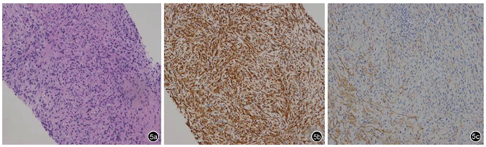 炎性肌纤维母细胞瘤(inflammatory myofibroblastic tumor,IMT)是一类少见的交界性间叶性肿瘤[1],既往常称为炎性假瘤,2002年世界卫生组织(World Health Organization,WHO)软组织肿瘤组织学分类中将其定义为由分化的肌纤维母细胞性梭形细胞组成的,常伴大量慢性炎细胞(浆细胞、淋巴细胞)浸润的一种肿瘤[2]。免疫组织化学Vimentin、SMA多呈阳性,CD117、CK常呈阴性。IMT常发于肺脏,罕发于肝脏,肝脏炎性肌纤维母细胞瘤(hepatic inflammatory myofibroblastic tumor,HIMT)发病率仅为0.7%,占肺外IMT的8%[3]。HIMT由Pack等[4]于1953年首次报道。HIMT病因不明,可能与感染、自身免疫异常、基因异常等因素相关[5]。韩国一项多中心研究[6]发现,45例HIMT患者中有7例(15.5%)伴糖尿病。既往亦有HIMT合并糖尿病的病例报道[7]。本例患者既往有糖尿病病史,推测糖尿病患者免疫力降低,与肝脏病变之间或许存在免疫学方面的作用机制,具体机制尚需进一步研究。本病可发生于任何年龄,以青壮年居多,多见于男性[3]。临床症状以腹痛为主,其他包括间断发热、乏力、体重减轻,部分可无症状[6]。患者常无肝炎及肝硬化,肿块多单发、局限于右叶,常见于肝被膜下,可与膈肌、周围脏器及腹壁粘连[6]。实验室反应炎性的指标可升高,如白细胞、C反应蛋白或红细胞沉降率等。肝功能丙氨酸转氨酶和(或)天冬氨酸转氨酶水平常正常或稍高,肿瘤标记物AFP、CA19-9及CEA常阴性。