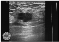 注:左乳9点钟方向可见一1.6 cm×1.0 cm×1.2 cm混合性回声团,形态欠规则,边界欠清晰
