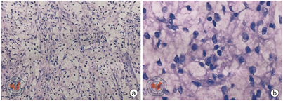 患者于2019年8月22日在全身麻醉下行左乳肿块局部切除并进行快速冰冻切片病理检查。标本为灰黄色不规则组织,大小为5.0 cm×3.0 cm×1.5 cm,切面可见1.4 cm×0.9 cm暗黄色病变,质软。冰冻切片病理检查显示:黄色瘤样细胞增生,结节样改变,建议常规病理检查确诊。常规病理检查显示:局部区域泡沫样组织细胞弥漫性增生,其间混杂小淋巴细胞(图2)。免疫组织化学染色:CD163(+)、CD68(+)、CK8/18(-)、上皮细胞膜抗原(epithelial membrane antigen,EMA)(-)、CK7(-)、P63(-)、S100(-)、转录因子Gata-3(-)、巨囊性病液体蛋白15(gross cystic disease fluid protein 15, GCDFP15)(-)、癌胚抗原(carcinoembryonic antigen, CEA)(-)、间变性淋巴瘤激酶(anaplastic lymphoma kinase, ALK)(-)、BRAF基因V600E突变(-)、HER-2(-),Ki67 5%。病理诊断:左侧乳腺ECD,建议行BRAF基因DNA测序及全身系统检查以排除其他器官受累。但是,患者拒绝进一步检查及后续治疗,于2019年9月3日出院。术后电话随访至2020年8月,未发现复发或其他器官受累征象。