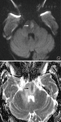 患者男性,59岁,急性起病,因"言语欠清伴右侧上下肢无力4 d"于2017年5月19日入院。患者5月14日活动状态下出现右侧上下肢无力,右上肢抬起费力,持物落地,行走拖步,家人还发现患者存在口角歪斜,言语含糊不清,当时未就诊。5月19日来安徽医科大学附属合肥医院神经内科门诊行头颅磁共振成像(magnetic resonance imaging,MRI)检查提示左侧脑桥旁正中急性期梗死(图1),收住入院。既往病史:有2型糖尿病史,近期自行停用胰岛素,否认高血压病、心脏病史,否认脑卒中及周围性面瘫病史。入院查体:体温36.3℃,脉搏86次/min,呼吸20次/min,血压140/70 mmHg(1 mmHg=0.133 kPa)。呼吸平稳,口唇无紫绀,心肺未及异常。腹软,全腹无压痛、反跳痛,肝脾肋下未及,双下肢无浮肿。神经系统查体:神志清楚,精神差,言语欠清晰,听理解正常。双眼视力正常,双侧瞳孔等大等圆,直径2.5 mm,对光反射灵敏,眼球位置居中,活动自如,眼球震颤(-)。右侧额纹变浅,右眼睑闭合较左侧稍差,Bell征阴性,右侧鼻唇沟浅,鼓腮漏气,两侧软腭上抬一致,悬雍垂不偏,咽反射存在,伸舌右偏。右上肢肌力Ⅲ级,右下肢肌力Ⅳ级,肌张力减低,左侧上下肢肌力Ⅴ级,肌张力正常,双侧深、浅感觉对称存在,共济运动检查大致正常。双侧Babinski征阴性。颈部无抵抗,双侧Kernig氏征(﹣),Brudzinski氏征(﹣)。辅助检查:血常规:白细胞2.87×109/L↓,红细胞3.42×1012/L↓,血红蛋白108.0 g/L↓,红细胞压积32.50%↓,血小板148.0×109/L;生化全套:三酰甘油0.43 mmol/L↓,总胆固醇3.90 mmol/L,低密度脂蛋白1.47 mmol/L↓,空腹血糖8.7 mmol/L↑,糖化血红蛋白7.6%↑,肝肾功能、电解质等正常;凝血指标、感染免疫、肿瘤指标均正常。心电图及动态心电图均正常;心脏彩超提示主动脉瓣钙化伴轻度反流,左室舒张功能减退;颈部血管彩超提示双侧颈动脉硬化伴混合回声斑块形成,椎动脉未见异常。头颅磁共振血管造影(magnetic resonance angiography,MRA)提示双侧大脑后动脉狭窄,椎基底动脉正常。入院后诊断左侧脑桥旁正中梗死(考虑系患者此次症状体征的责任病灶),脑梗死病因分型符合穿支动脉病。予以双联抗血小板、调脂、改善侧支循环、脑保护、清除自由基、调节血糖等治疗。6月1日患者面瘫未完全恢复至正常,行面神经电生理检查:瞬目反射、面神经传导速度、肌电图未见异常。经治疗后患者右侧面瘫及肢体肌力明显改善,血糖控制平稳,于6月5日出院。