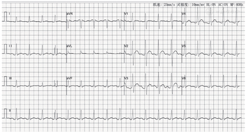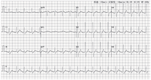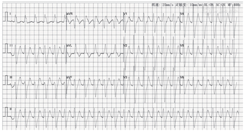 注:心率107次/min,QRS波宽度约114 ms,额面电轴+50°
