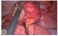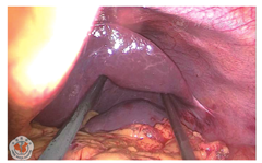 患者女,40岁,身高160 cm,体质量52 kg,因2 d前无明显诱因出现左下腹部持续性绞痛,于2018年10月19日急诊入院,体温37.7℃,脉搏112次/分,伴稍恶心,无呕吐、放射痛、发热,无腹泻、血便,无尿频、尿痛等症状。1 d前曾在当地社区医院以"急性肠炎"给予抗感染、解痉等治疗,自觉症状有所缓解,次日午间症状再次加重。查体:左下腹压痛(+)、反跳痛(+),局部腹肌紧张明显。行腹部CT平扫检查示:结肠走行反位,右半结肠位于左上腹,阑尾增粗伴周围渗出,周围间隙模糊,阑尾最粗约1.7 cm,临近盲肠壁稍增厚;胃腔大部分位于右侧,十二指肠垂直下行,可见Ladd束带;肝脏体积明显增大;脾脏受推挤,位于左侧肾上腺前方(图1,图2,图3)。诊断为"结肠反位,阑尾炎累及盲肠"。血常规检查示:白细胞计数8.81×109/L,中性粒细胞百分比79.5%。综合各项检查结果,诊断为"急性肠旋转不良型左侧阑尾炎",遂于当夜急诊行腹腔镜下异位阑尾切除术。腔镜探查示盆腔内大量积脓,大网膜覆盖左侧回盲部,乙状结肠位于盆腔右侧,肝左叶明显增大并覆盖脾脏,胆囊仍位于右侧,切除阑尾及网膜组织大小约8.0 cm×6.0 cm×2.5 cm(图4,图5,图6,图7)。
