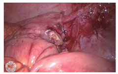 腹腔镜手术或开腹探查手术是治疗左侧阑尾炎的主要方式。由于术前已考虑为左侧阑尾炎,故腔镜Trocar放置位置为常规位置的镜像旋转,脐上置10 mm Trocar,右侧腹壁及右下腹壁分别置入5 mm及12 mm Trocar,为方便右手操作以he-mo-lock夹夹闭阑尾根部,右下腹麦氏点所置Trocar为12 mm,其他手术操作过程与常规腹腔镜下阑尾切除术无异。