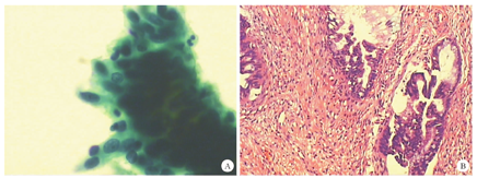 AGC易与反应性颈管细胞相混淆,虽后者也有细胞核增大、细胞核/细胞质增高等特性,但反应性颈管细胞仍保存正常蜂窝状结构,细胞核不重叠或少有重叠,核染色质细腻,细胞核膜光滑,形态呈圆形、卵圆形,小核仁反而明显,细胞质丰富。而当AGC细胞团细胞排列明显拥挤、核深染、细胞核/细胞质明显升高,但细胞团周边出现明显羽毛结构或呈带状复层排列时,应判定为AGC倾向肿瘤或AIS(图1、图2)。而当细胞团呈菊蕊状排列且有大核仁时,需考虑浸润性GLCA,而部分分化特别好的黏液GLCA单从细胞形态上进行诊断并不容易,亦要关注有无肿瘤性背景(图3)。HSIL涂片中出现AGC不足为奇,组织学切片中CIN Ⅱ~Ⅲ级及SCC中合并宫颈腺上皮的不典型增生、腺原位癌甚至GLCA并不少见。因腺上皮位置较深,故可从涂片中筛检出的患者常为少数,需引起注意的是,AGC判定的特异性及可重复性差,这种拥挤的细胞团在光镜下有时很难分清是鳞状细胞还是腺细胞,不少AGC患者组织活检结果为SIL,可能属上述情形。本研究中,58例AGC患者组织活检结果证实,13例为CIN Ⅰ级,10例为CIN Ⅱ级和CIN Ⅲ级,5例为宫颈AGC,2例为AIS,1例为宫颈GLCA,2例为宫颈SCC。因此,AGC的检出与SIL病变有一定相关性,同时应注意分化较差的SCC在细胞学涂片上很难与GLCA区分,这与国外相关报道一致,应引起细胞学诊断医师和临床医师的重视,作出AGC判读可提示宫颈活检的重点部位。总体而言,LCT对于筛查GLCA的敏感度明显优于巴氏涂片,这一说法得到肯定,Johon等报道,112 058例患者中筛查出27例宫颈GLCA,而本研究61 610例患者中仅筛查出2例AIS和5例GLCA,两组比较,结果相差甚远,这可能与国内外宫颈GLCA的发生率有关,亦可能在细胞学判读中漏判。近年来宫颈GLCA的发生率呈上升趋势明显[12],筛查中对于异常腺上皮的判读应予以重视。