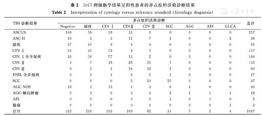 61 610例标本的细胞学结果分别为ASCUS(749例),LSIL(632例),HSIL(237例),ASC-H(36例),SCC(37例)和GLCA及其他类型(60例)患者中,分别257例、416例、209例、36例、37例和60例进行阴道镜下多点组织活检,活检率分别为34.3%,65.8%,88.2%,100.0%,100.0%和100.0%。因此,总计1017例细胞学结果呈阳性的患者进行多点组织活检。TBS细胞学诊断与多点组织活检诊断结果对照(表2)显示,LCT诊断与多点组织活检诊断结果的符合率顺次为HSIL(CINⅡ~Ⅲ+HSIL合并湿疣)(82.77%, 173/209)>SCC(67.57%,25/37)>LSIL(湿疣+CINⅠ+CINⅡ合并湿疣)(63.46%,264/416),而细胞学诊断为ASCUS的患者多点组织活检结果中,148例(57.6%)为炎症,这表明LCT的假阳性主要来源于对LSIL和ASCUS的判定。同时应注意,LCT对宫颈癌的筛查,并未达到100%,存在低诊和漏诊。虽然其低诊和漏诊率并不高,但可能会严重影响被低诊和漏诊患者的及时治疗。