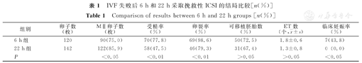 IVF失败后6 h和22 h采取挽救性ICSI的结局比较[n(%)]