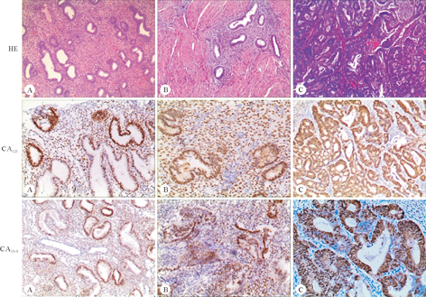 The observation of HE morphological and immunohistochemical staining of CA125 and CA19-9 in three groups (A: Normal endometrial, B: Endometriosis, C: Endometrial cancer)