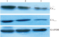 The expression of CA125 and CA19-9 in the three groups detected by Western blot (A: Endometrial cancer, B: Endometriosis, C: Normal endometrial)