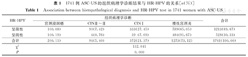 1741例ASC-US的组织病理学诊断结果与HR-HPV的关系[n(%)]