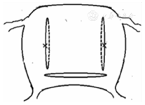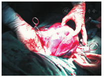 简易子宫压迫缝合术适用于因剖宫产术中胎盘娩出后子宫收缩乏力造成的出血,即子宫体部收缩乏力性出血。该方法如下:所有患者均接受子宫下段剖宫产术,术中将子宫托出腹腔外,行子宫压迫试验,若加压后出血基本停止,则实施子宫压迫缝合术。所有缝线均采用1#可吸收线(强生公司,美国),先缝合子宫切口(2侧各缝合1针止血):在子宫下段右侧切口上缘上方1 cm,距离右侧子宫旁1.5 cm处进针,贯穿子宫前、后壁,自子宫后壁同一位置出针,缝线继续沿子宫后壁,走行在距离子宫底及右侧宫角各2~ 3 cm处进针,贯穿子宫前、后壁浆肌层,在子宫前壁同一位置出针,在前壁下段打结,松紧适度,剪断缝线;同法处理子宫左侧另一缝线。此为平行于子宫体纵轴的2条独立的子宫缝线,打结后子宫体纵向压迫,使宫体缩小、宫腔压迫,观察宫腔内无活动性出血后,尽快将子宫切口连续缝合,子宫放回腹腔,常规关闭腹腔,如图1, 图2, 图3所示。改良的B-Lynch缝合术的操作方法参考武爱萍[2]的手术方法执行。