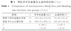 50例行简易子宫压迫缝合术患者术后均有效止血,子宫收缩好,阴道出血量减少、甚至出血停止,无一例子宫切除。所有患者产后出血量为300~1 200 mL,出血最多1例因高龄合并妊娠期糖尿病、妊娠期肝内胆汁淤积症、慢性乙型肝炎,全子宫不收缩而出血迅速,出血量约为1 500 mL。该患者经子宫压迫缝合后出血停止,保住了子宫,输血600 mL。两组术中出血量及止血时间比较,如表1所示。
