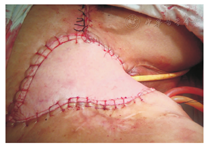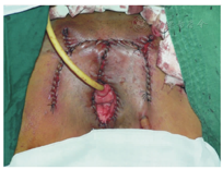 菱形皮瓣以会阴后联合为蒂,在缺损区一侧或两侧会阴及股内后侧各设计一菱形筋膜皮瓣,皮瓣长宽比极限为1︰4,皮瓣面积略小于缺损面积。于皮瓣远端深筋膜下翻起皮瓣,完全翻起后根据缺损区深度决定是否切除部分筋膜组织,以保证皮瓣厚度与缺损相近。皮瓣蒂部松解后转至缺损区,在无张力情况下缝合。供区两侧作深筋膜下游离后直接拉拢缝合,创面放置闭式引流管(图1, 图2)。若需修复阴道缺损,则皮瓣远端纵行切开后分别修复外阴和阴道缺损,皮瓣面积应略大于缺损面积。股前外侧皮瓣的制备技术参见文献[15,16]。其皮瓣以髂前上棘和髌骨外侧缘连线中点为中心,设计为梭形,于皮瓣内侧缘切开,在阔筋膜深面分离寻找穿支。对股直肌和股外侧肌间隙穿支则逆行解剖穿支血管的来源血管,即旋股外侧动脉降支或横支,或直接打开肌间隙解剖显露旋股外侧动脉降支或横支,顺行解剖其皮穿支或肌皮穿支,术中解剖并游离股神经肌支,对肌间穿支采用超声刀切断其周围肌肉,保留少许肌袖于血管蒂中,后切开皮瓣外侧缘皮肤,深至阔筋膜,于阔筋膜下掀起皮瓣,直至皮瓣完全游离,继续游离血管蒂至其汇入股动脉处,完成皮瓣制备。皮瓣经皮下隧道送至缺损区,与缺损边缘皮肤缝合(图3),术中注意血管蒂部是否扭曲或受压,应在供区皮肤无张力下直接拉拢缝合。