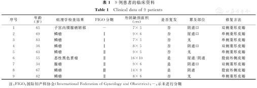 选择2007年7月至2012年6月于汕头大学医学院附属肿瘤医院妇瘤科行外阴癌手术9例女性患者为研究对象(本研究遵循的程序符合汕头大学医学院附属肿瘤医院人体试验委员会所制定的伦理学标准,得到该委员会批准,并征得受试对象本人的知情同意,与之签署临床研究知情同意书),其年龄为34~ 83岁,中位年龄为63岁。9例患者临床资料,如表1所示。