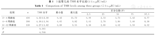| 组别 | n | TSH水平 | 最小值 | 最大值 | 百分位数(P) | ||||