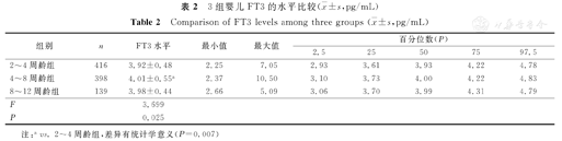 不同年龄段婴儿FT3水平比较,如表2所示。