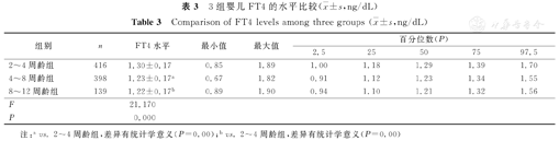 不同年龄段婴儿FT4的水平比较,如表3所示。