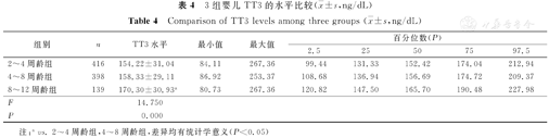 不同年龄段婴儿TT3水平比较,如表4所示。