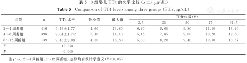 不同年龄段婴儿TT4水平比较,如表5所示。