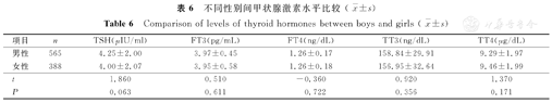 不同性别间各甲状腺激素水平比较,如表6所示。