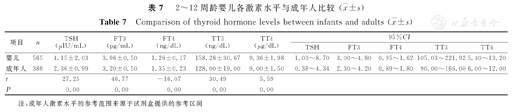 2~ 12周龄婴儿甲状腺激素水平与成年人比较,如表7所示。