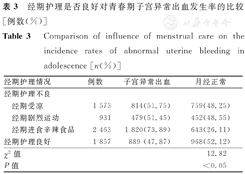 本研究纳入受试者的经期护理情况包括经期受凉(冬季衣着单薄、洗冷水浴等)、经期剧烈运动、经期进食辛辣食品及经期护理良好。结果显示,经期受凉者为1 573名,其中子宫异常出血者为814名(51.75%);经期剧烈运动者为931名,其中子宫异常出血者为479名(51.45%);经期进食辛辣食品者为2 463名,其中子宫异常出血者为1 820名(73.89%)。经期护理良好者为1 857名,其中子宫异常出血者为889名(47.87%)。经期护理良好与经期护理不良的青春期女生子宫异常出血发生率比较,差异有统计学意义(χ2=12.82,P<0.05)。经期护理对青春期子宫异常出血发生率的比较,如表3所示。