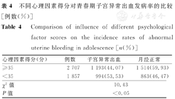 Comparison of influence of different psychological factor scores on the incidence rates of abnormal uterine bleeding in adolescence [n(%)]