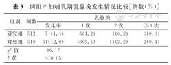 两组产妇哺乳期乳腺炎发生情况比较[例数(%)]