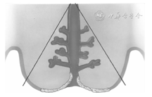 宫颈锥切术的应用范围:宫颈锥切术应用于年龄较大者,或阴道镜观察未见宫颈病变者,应呈尖锥状切除;而对于较年轻者或阴道镜检查不能明确为宫颈病变者,则应以蘑菇状区作为锥切术区域为宜(图1,图2)。