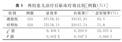 两组患儿治疗后临床疗效比较[例数(%)]