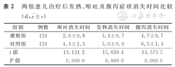 两组患儿治疗后发热、呕吐及腹泻症状消失时间比较(d,