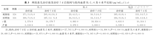 两组治疗7 d后与治疗前组内血清IL-2、-6及-8水平比较,血清IL-2水平均较治疗前显著上升,而血清IL-6与-8水平,则较治疗前显著下降,差异均有统计学意义(P<0.05)。治疗7 d后,观察组血清IL-2水平较对照组显著升高,而血清IL-6与-8水平均显著低于对照组,差异亦均有统计学意义(P<0.05),见表3。